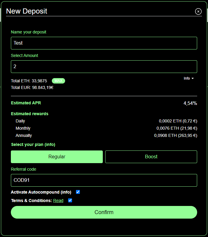 Your deposit is activated immediately and starts generating returns on the same day you make it. Forget about waiting to start generating returns on your Eth!