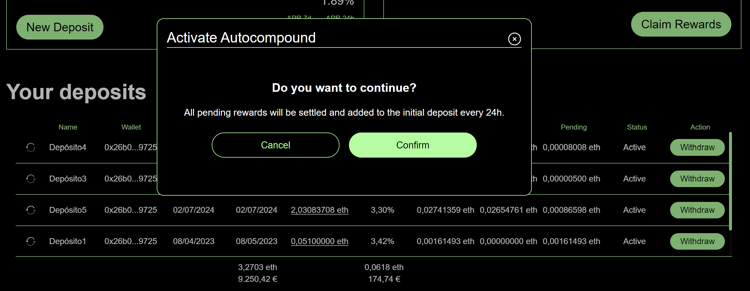 Activate autocompound so that your generated rewards are included in your initial deposit every day. This will improve the efficiency of your deposits!