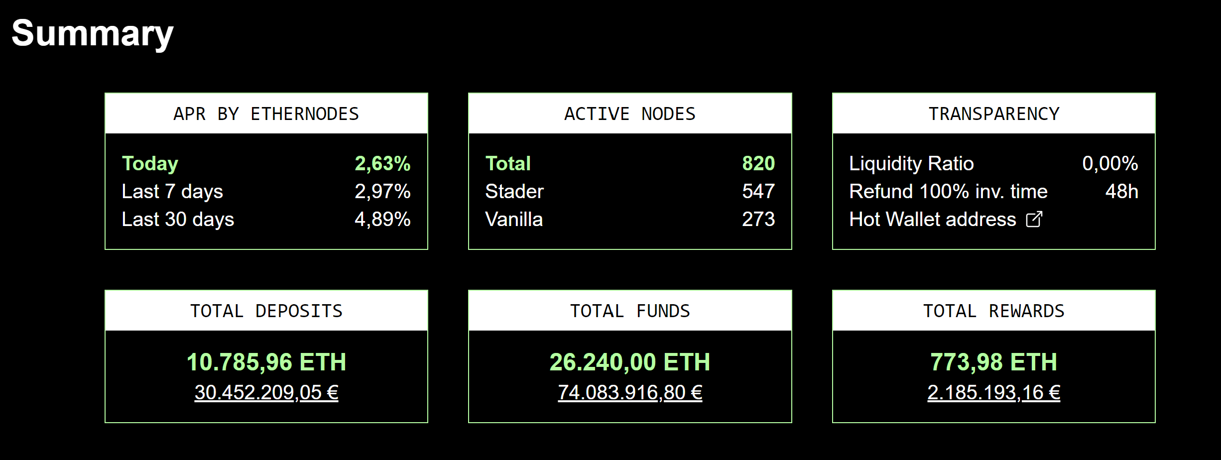 Probablemente sea una información que, como usuario, no te aporte datos importantes. Al fin y al cabo, si has decidido utilizar Ethernodes es porque quieres sacar una buena rentabilidad a tus ETH sin entrar en apalancamientos ni loops recursivos, haciendo staking puro y abstrayendo la dificultad técnica y de capital del propio staking.